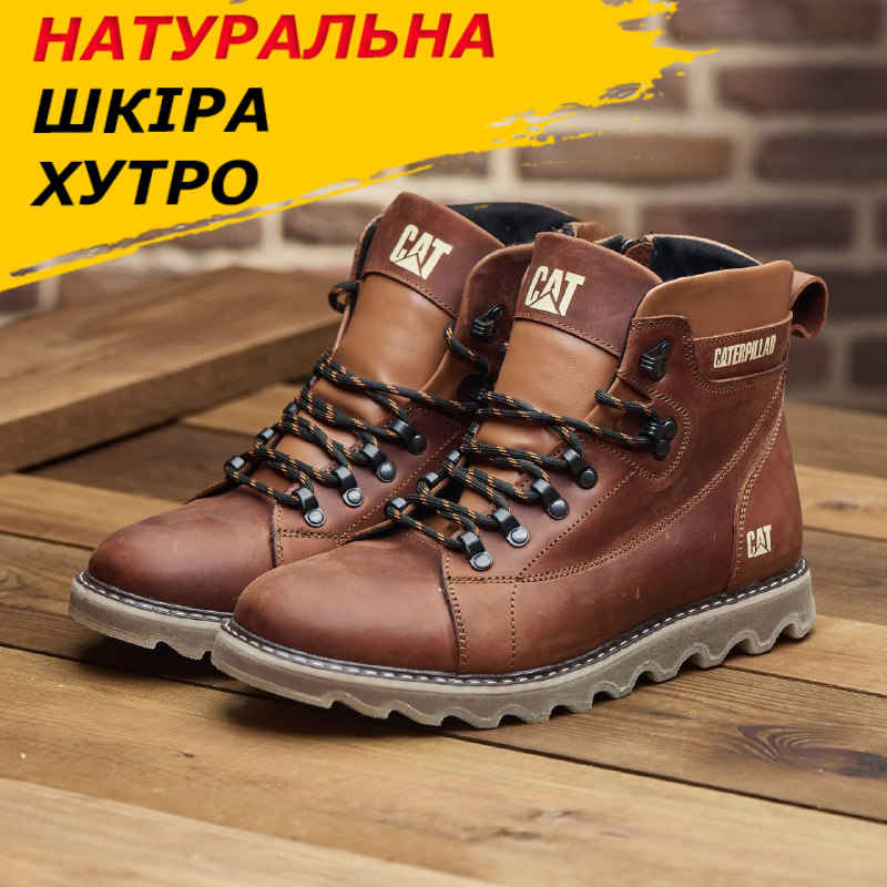 (063) 877-58-79 Шкіряні високі черевики CAT коричневі на товстій підошві зимові класичні чоловічі на хутрі на зиму